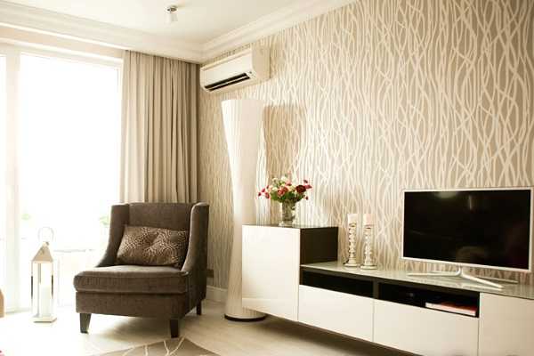Этот вид обоев аналогичен виниловым. Однако, акрил, в отличие от винила наносится не сплошным слоем, а точечно. Поэтому такой настенный материал пропускает воздух. Кроме того, акриловая поверхность практична и долговечна, не боится влаги и механических повреждений. Ниже можно увидеть фотографии модных акриловых обоев для маленьких гостиных.