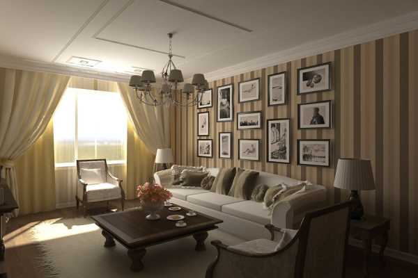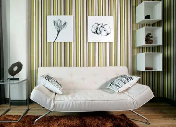 Чтобы визуально поднять потолок, используются обои с вертикальными полосками, которые нежелательны в длинных, узких комнатах. Зал с такими обоями будет напоминать коридор.