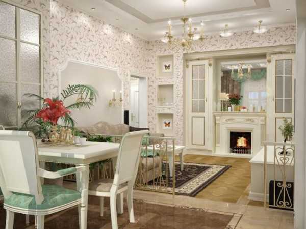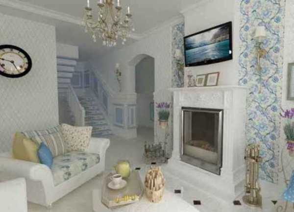 Обои для такой гостиной должны выбираться соответствующие. Отдавайте предпочтение нежным оттенкам и пастельным тонам. Украсить стены можно также семейными фотографиями или пейзажными картинами.