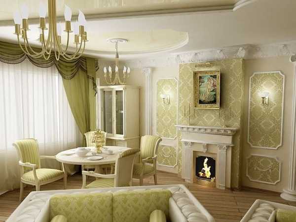 В гостиной классического стиля хорошо будут смотреться обои спокойных расцветок: песочной, кремовой, бежевой, нежно-розовой, светло-голубой, оливковой, цвета слоновой кости. На обоях для гостиной в классическом интерьере могут быть крупные узоры: дамаск, вензеля, растительный орнамент, королевские лилии. Рисунок наносится краской золотого, серебряного, бордового цвета. Если стены однотонные, они украшаются багетами, карнизами, лепниной и молдингами.