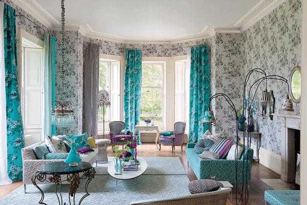 Потрясающее сочетание ярких и бледных тонов дает невероятный эффект, такая гостиная смотрится просто сказочно, а постоянно повторяющийся цветочный мотив делает комнату очень нежной и утонченной.