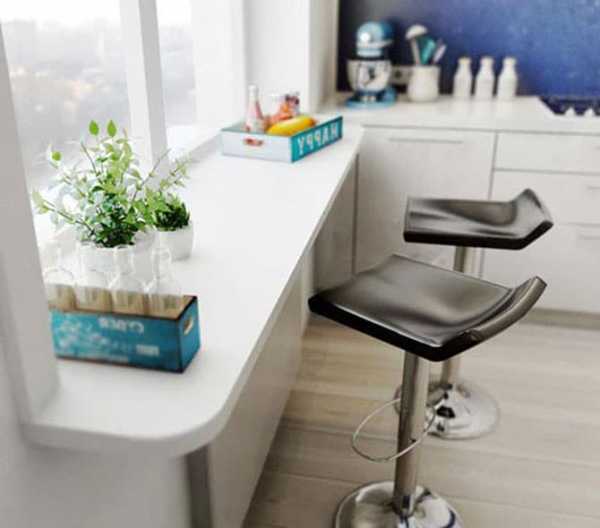 В типовой малогабаритной квартире («хрущевке») полноценно разместить все желаемые предметы мебели не представляется возможным. Поэтому от чего-то придется отказаться или же проявить изобретательность. Если из окна кухни открывается нормальный вид, установить стойку можно, совместив ее с подоконником. Конечно, если его высота от пола не менее 90 см.