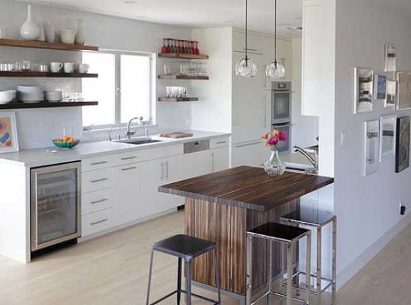 Только толстый массив дерева, возле которого, например, стоят три-четыре барных стула с белыми сидениями на металлических ножках, способен придать дизайну кухни элегантность, сочетающуюся с роскошью.