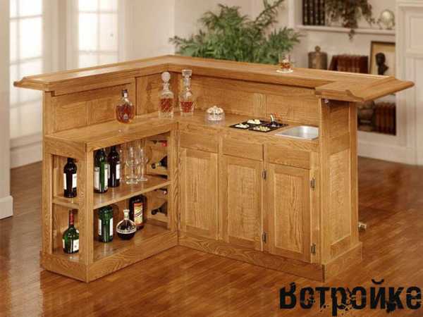 При наличии достаточного места в квартире в ней, если есть желание, всегда можно выделить отдельный угол или даже небольшое помещение для создания полноценного бара. Хорошо при этом, если там будет и холодильник, и мойка, и шкафчики или полки для бокалов и спиртных напитков.