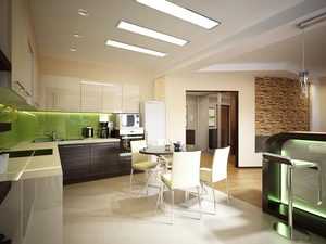 Также комбинированный вариант можно использовать в интерьере кухни — гостиной. Здесь визуально можно разделить помещение на отдельные зоны. В этом случае барный стол располагают со стороны гостиной, а обеденный соответственно в кухонной зоне. При таком решении хотя зоны и разделены, но совершенно отсутствует ощущение замкнутости.