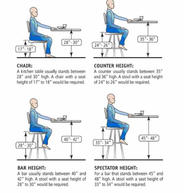 Рекомендуемые высоты сидений относительно различных высот столешниц (1 дюйм — 2,54 см)