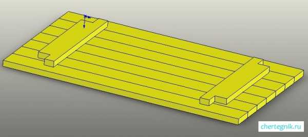 2. Изготовить две детали для соединения досок столешницы и крепления к ним ножек. Для этого на отрезке доски 100 х 20 мм сделать вырезы по углам на противоположных концах размером 60 х 60 мм. Прикрепить полученные заготовки к столешнице, как показано на рисунке.