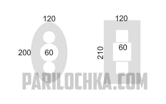 Пятиместный — круг 100 см, пятно 240; прямоугольник, размером 135 на 85 см, пятно — 235 на 225 см.