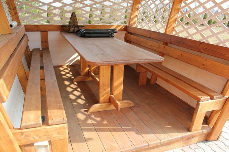 Деля все своими руками, вы уже имеете в голове завершенную идею, и сможете с точностью воплотить ее в жизнь. - Габариты. Не менее значимый фактор. В процессе разработки проекта вы учитываете все размеры павильона и стульев или лав. Вам не придется бегать по магазинам в поисках мебели нужного размера. Вам будет достаточно сделать правильный чертеж.