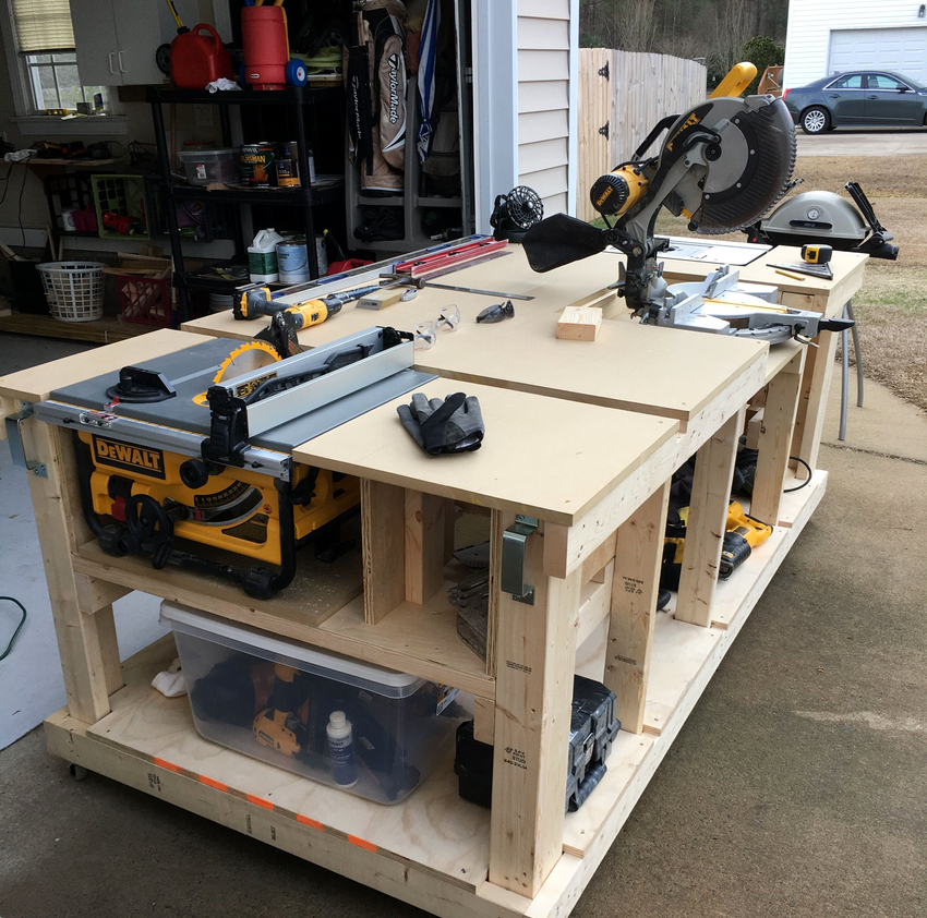 Этот простой стол для гаража является идеальной мобильной многофункциональной конструкцией для проведения ремонтных работ, хранения инструментов и выполнения различных проектов. Особенно удобна полусредняя полка, чтобы держать под рукой электроинструменты. Высота идеально подходит в качестве выхода для настольной пилы.