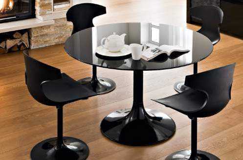 Необычный глянцевый черный стол круглой формы для гостиной