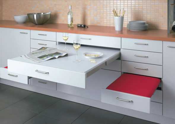 Самым компактным будет откидной, который прикрепляется к стене и опускается только во время приема пищи. Интересен и вариант выдвижной столешницы, встроенной в кухонный гарнитур и в сложенном виде маскирующейся под ящик. Для одного человека такой вариант подойдет.