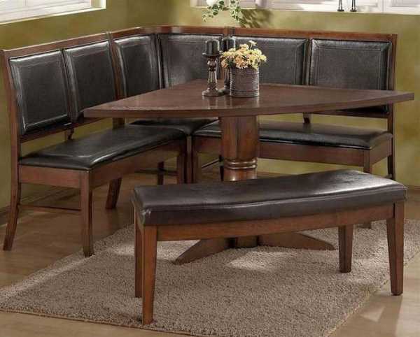 Мебель для приема пищи угловой формы — идеальное решение для небольшой по площади кухни или зонированного жилого помещения. Размеры его зависят от дизайна конкретного образца и от числа людей. Однако норма 60,0 сантиметров на человека сохраняется при выборе треугольных изделий. При этом модели в виде полукруглого сегмента способны вместить больше едоков, чем экземпляры с прямыми линиями периметра.