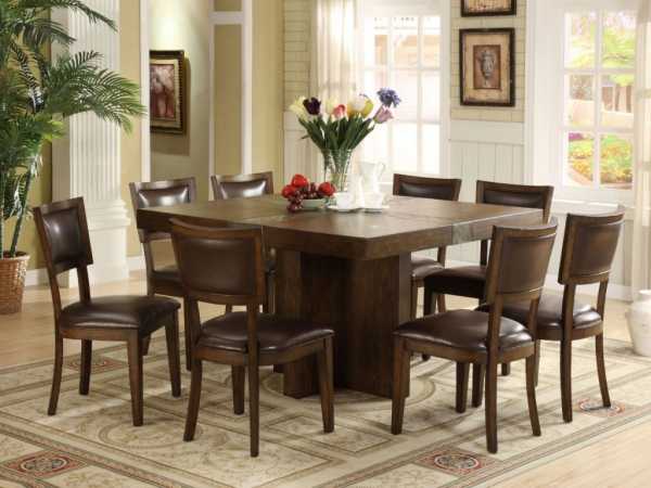 - Квадратный. Ввиду небольших размеров это стандартный вариант для маленькой кухни. Если для обеда нужно больше пространства, лучше приобрести раскладную конструкцию. Это позволит занять минимум пространства в обычный период и сделать его удобным во время обеда.