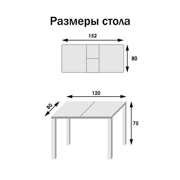 - Конструкция с размером столешницы 80 на 120 см подойдёт для семьи из четырёх человек.
