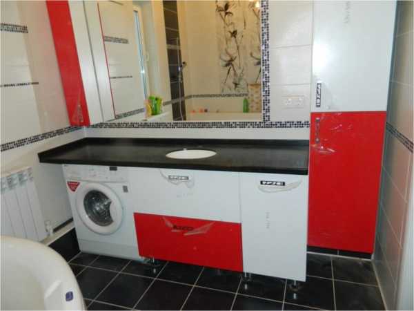 - Монтаж на мебель. Сделать внизу несколько полок или тумб, а сверху установить столешницу — один из вариантов обустройства ванной.