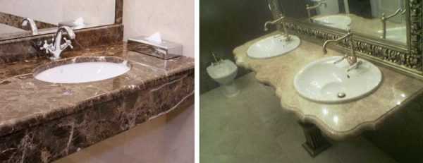 На самом деле это два разных материала, но внешний вид может быть похожим. Столешница для ванной комнаты под раковину из натурального камня изготавливается из плиты толщиной в несколько сантиметров. В нужных местах проделывают отверстия, затем шлифуют и полируют.