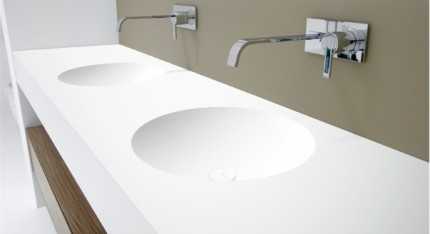Существую еще раковины с цельнолитой столешницей (называют еще наоборот — столешница с цельнолитой или интегрированной раковиной). Эти сантехнические изделия делают из фарфора, фаянса, искусственного камня. Их устройство полностью исключает протекание воды, так как никаких швов нет — раковина — это только углубление в плоскости, все сделано из монолитного материала. Имеется только отверстие для установки сифона и крана (для крана есть не всегда, так как могут устанавливаться настенные модели).