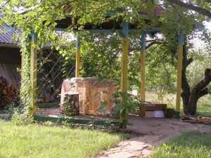 Шпалера беседочной конструкцииВсе это необходимо перемешать с землей верхнего слоя, уплотнить и залить водой. После впитывания воды насыпьте в яму 15-сантиметровый слой плодородной земли и высадите саженец. Чтобы молодые корешки растения не обжечь удобрениями, засыпьте их чистой плодородной землей и хорошо полейте.