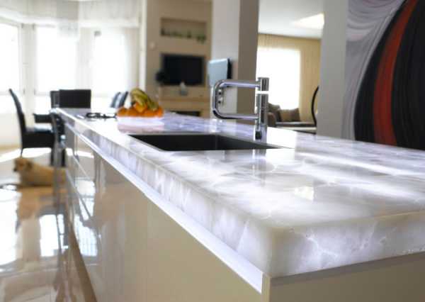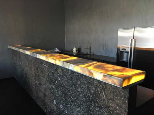 Оникс — это полудрагоценный минерал, из которого изготавливаются совершенно уникальные столешницы. Подсветка столешницы из оникса создает захватывающий дыхание эффект: столешница как будто начинает излучать солнечный свет.