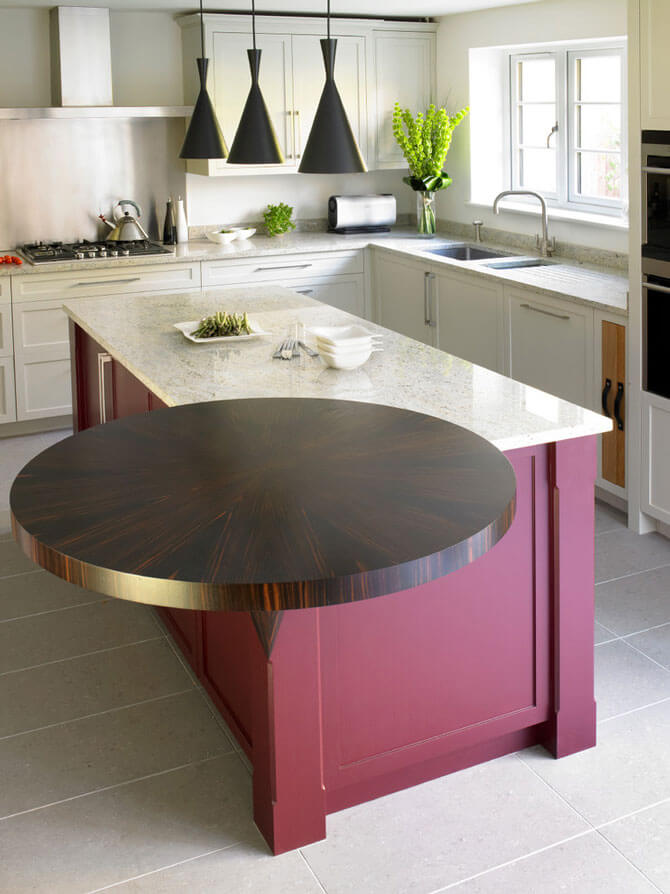 - Большой плоский островок позволяет подчеркнуть красоту куска кварца или гранита, а не делить его на несколько уровней. Мы считаем, что это самая распространенная причина, по которой люди выбирают островки с противовесом!