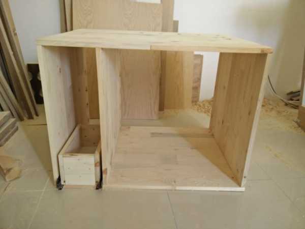 После этого днище соединяется между собой досками. Итогом должна стать коробка, в которой остаются открытыми две боковые стороны. На заключительном этапе к ней крепятся деревянные ножки, которые изготавливаются отдельно и обязательно должны быть одинаковой длины во избежание перекоса уже готового изделия.