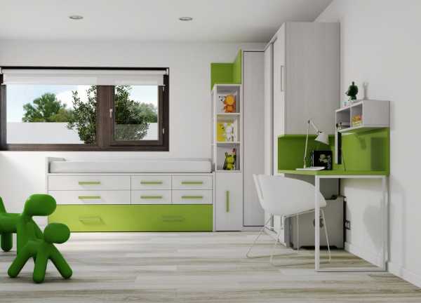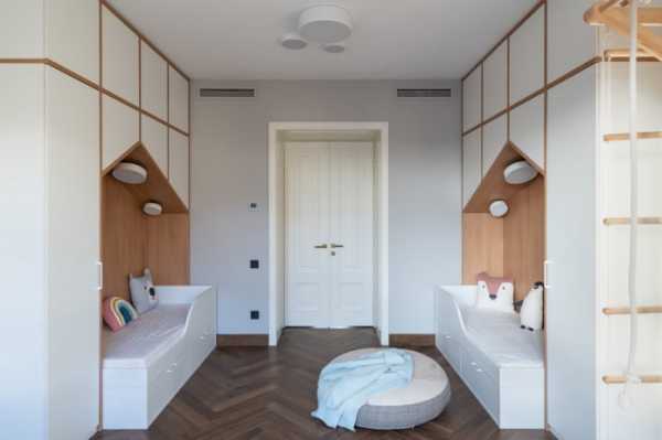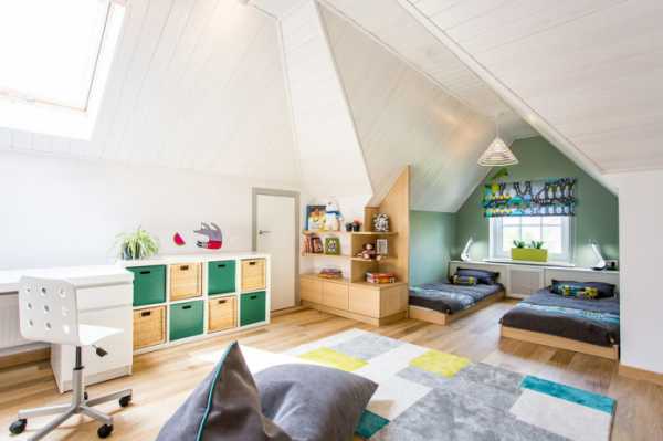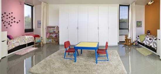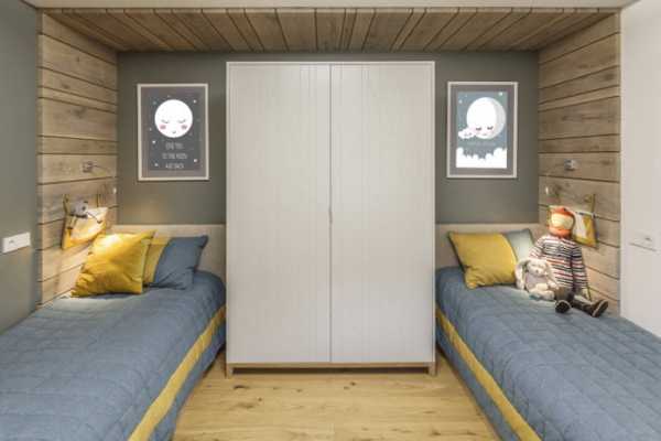 Также популярно расположение кроватей по одной стене. С противоположной стороны устанавливаются системы хранения, и обустраивается зона для игр.