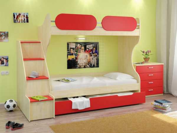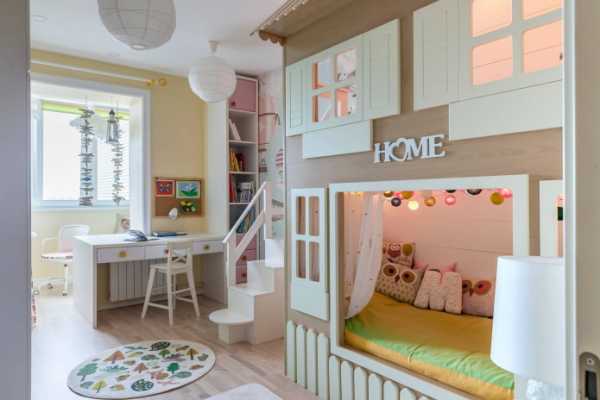 Большим плюсов в этом способе будет наличие у детей собственного пространства, у каждого – отдельный стол, шкаф, компьютер и даже настольная лампа. Минус у такой конструкции только один: с годами наши дети растут, и не всегда спальное место им будет в пору, а кровать чердак длиной 2 метра – очень сильно съедает пространство, даже если она одна в комнате.