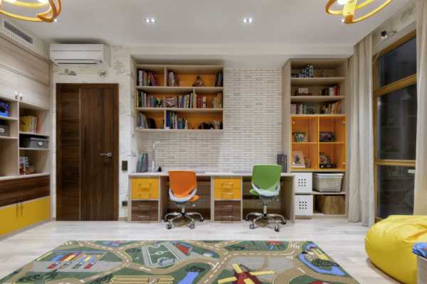 Самым простым решение является покупка большого письменного стола для двоих детей, который можно расположить посередине комнаты, не занимая стен. Единственным минусом будет то, что дети во время занятий будут смотреть друг на друга.