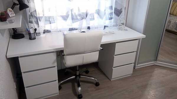 Есть готовые решения, позволяющие расположить письменный стол для двоих детей возле окна, Одна проблема, у готовых письменных столов для двоих детей нет продолжения в виде шкафчиков, тумбочек. полочек и т.д. Места для хранения школьных принадлежностей, канцелярии придется продумывать отдельно.