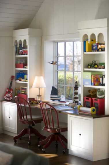 Будет замечательно, если вы обустроите детские рабочие места как показано на последнем фото. Таким образом, используя высокий комод, у каждого ученика появляется некое подобие уединения, и дети будут меньше отвлекать друг друга от выполнения домашнего задания.