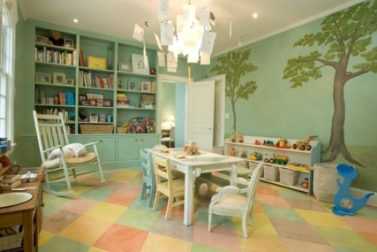 Стол для двоих детей зеленого цвета в ярком интерьере детской игровой комнаты, что может быть лучше