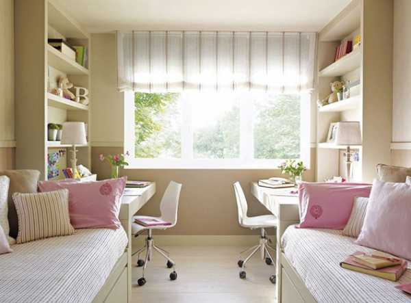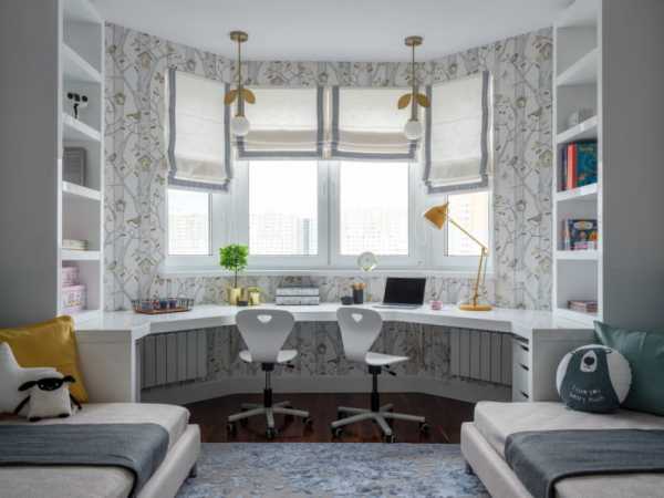 Для тех, у кого в детской имеется широкое окно, подойдет размещение двойных письменных столов вдоль окна. Правда, здесь есть некоторые нюансы, которые следует учесть: