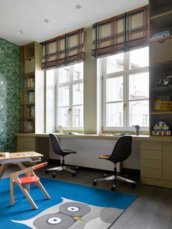 Как правило, ширина детской комнаты превышает два метра. Стандартный оконный блок занимает половину стены. Расположение письменных столов для двух детей у окна – идеальное решение. Правда придется обратиться в мебельную компанию, так как стандартные варианты не могут учитывать все особенности вашей детской комнаты.