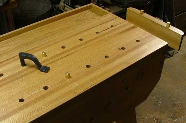 В передней части верхней крышки высверливается ряд отверстий для установки струбцин, клиньев и других деталей для крепежа крупных деталей. В задней части рабочей поверхности предусматривают углубление – оно предназначено для мелких деталей и фурнитуры. Можно заменить сложную в изготовлении выемку периметром из деревянных реек.