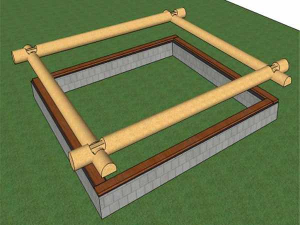 Поверх отсечки, точно посредине ленты, устанавливает обвязочные балки, которые временно можно скрепить по углам гвоздями. После этого выравниваете периметр, замеряя диагонали – они должны получиться одинаковыми, с точностью допуска до 2-3 мм.