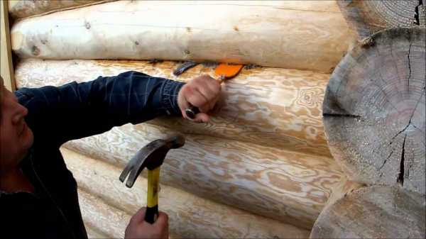 Тогда как если вы решили применить мох или паклю, то после завершения усадки баня будет требовать дополнительной конопатки щелей между венцами. Для этого используется конопатка, молоток и деревянная лопатка. Весь процесс выглядит следующим образом: после усадки дома в щели плотно забивается пакля.