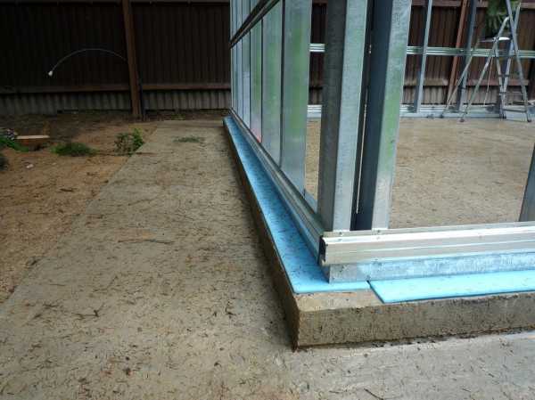 Стальные профили металлического каркаса соединяются с помощью сварки либо же посредством специальных шурупов. С помощью дюбелей на фундамент устанавливается закладной профиль, иначе называемый ригелем. От точности расчетов при установке ригеля будет зависеть дальнейшая симметрия архитектурных форм постройки. Профиль выравнивают по горизонтали, затем следует монтаж гидроизоляционной ленты в пространство между ним и фундаментом.