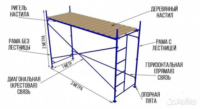 - Рамные – состоят из вертикальных рам, которые соединяются при помощи связей в цельные конструкции. В комплект входят: рамы, лестницы, деревянные настилы, башмаки, горизонтальные и диагональные связи.