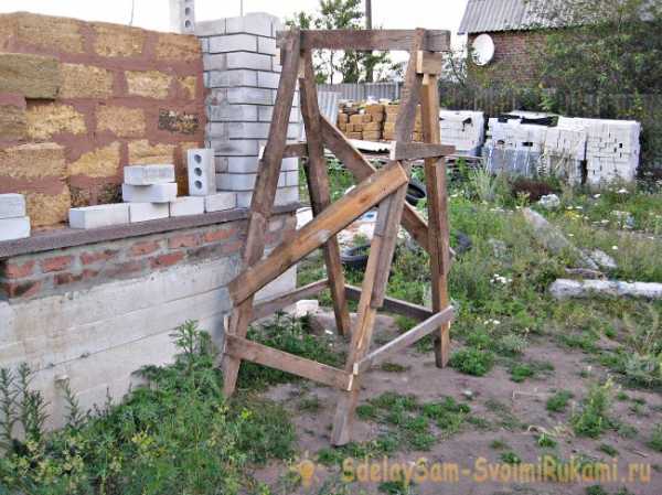Из минусов самостоятельного изготовления надо отметить, что конструкция необходима только на момент строительства дома. После этого она уже не требуется, но средства и время на изготовление уже затрачены. Вес конструкции может быть значительным, значит, требуется подготовка площадки, а это снова затраты на материалы.
