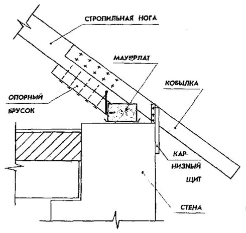 Нижние части стропильных ног опираются через мауэрлат, позволяющий распределить нагрузку равномерно, на внешние стены. Верхними концами ноги стропил опираются на промежуточные подгоны или брус под коньком.