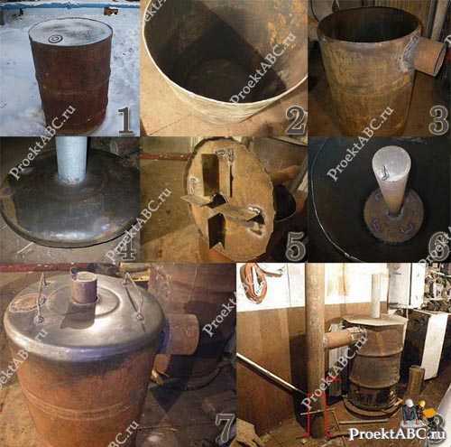 Собрать подобную конструкцию можно из подручных материалов. Мы потом рассмотрим шаги устройства печки на отработке своими руками.