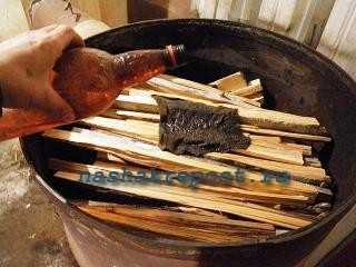 Для начала заполните бочку дровами примерно на треть. Накройте котел крышкой, предварительно бросив в него зажженную спичку, чтобы начало разгораться пламя. Перед этим добавьте в него керосин, который обеспечит более эффективный розжиг.
