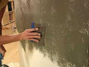 - Следующий этап – нанесение состава на стену, используют шпатель под углом 60°. На этом этапе есть возможность проявить креативность. Существует несколько вариантов отделки: горизонтальное, вертикальное и круговое расположение бороздок.