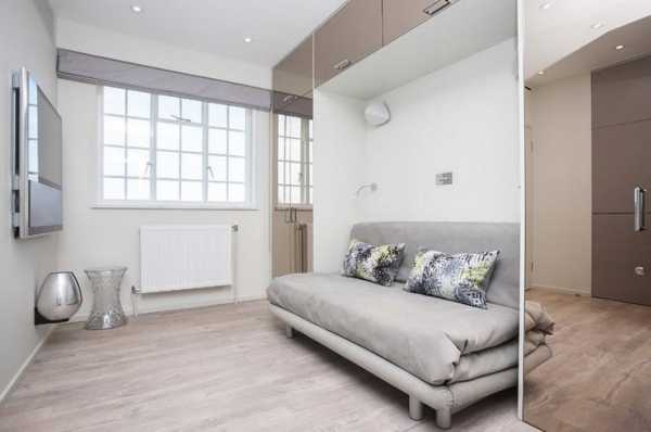 Если в квартире нет места для полноценной кровати, выберите удобный раскладной диван. Массивную стенку заменят полки или небольшой стеллаж.