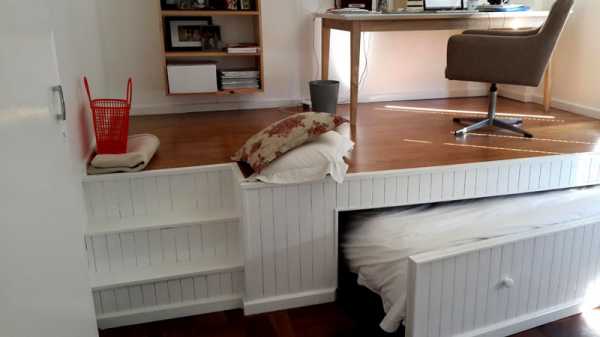 - пол разного уровня. Кровать можно расположить на подиуме – это выделит спальную зону, а также позволит организовать дополнительные места хранения, убиваем двух зайцев;