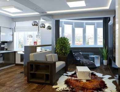 - Если в квартире есть балкон, то его можно объединить с жилым пространством. Такое решение расширит жилое помещение и даст больше света. Но при этом необходимо утеплить балкон. А место, где было окно, прекрасно превращается в барную стойку.