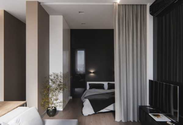 На фото спальная зона в дизайне квартиры 35 кв., отделенная тканевой шторой серого оттенка.