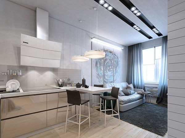 Например, в студии будет намного рациональней установка кухонного гарнитура практически до потолка, таким образом получится увеличить вместительность и скрыть за фасадом, такие предметы, как посуда, бытовая техника и прочая утварь. Достаточно актуальными для оформления помещения, считаются разнообразные перегородки или барная стойка.