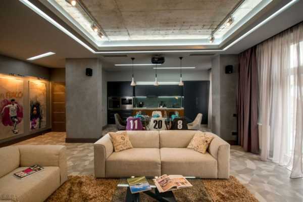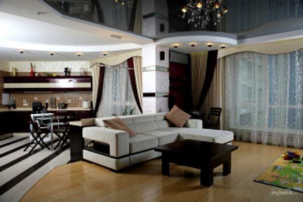 Особенно оригинальным интерьерным решением считается зонирование за счет разного уровня подвесных потолков и пола, например, в виде подиума или отделочных материалов, отличающихся по цвету или наличию рисунка.